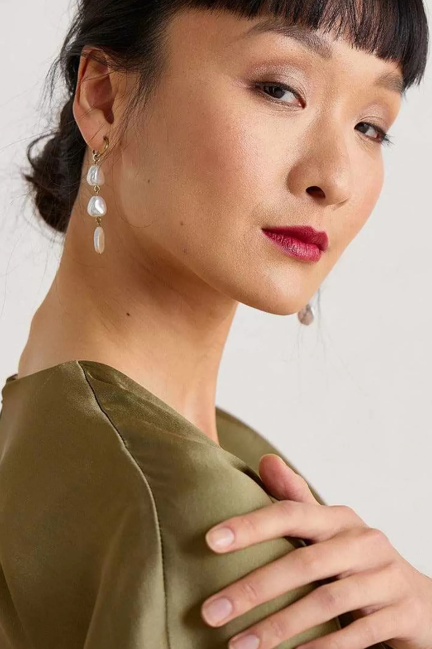 A Contemporary Twist On A Classic Pearl Earring, With Two Naturally Shaped Freshwater Pearls Above A Single, Teardrop-Shaped Bead. We Love The Simplicity And Movement Of This Timeless Piece, And Are Sure You’Ll Find So Many Ways To Wear It.