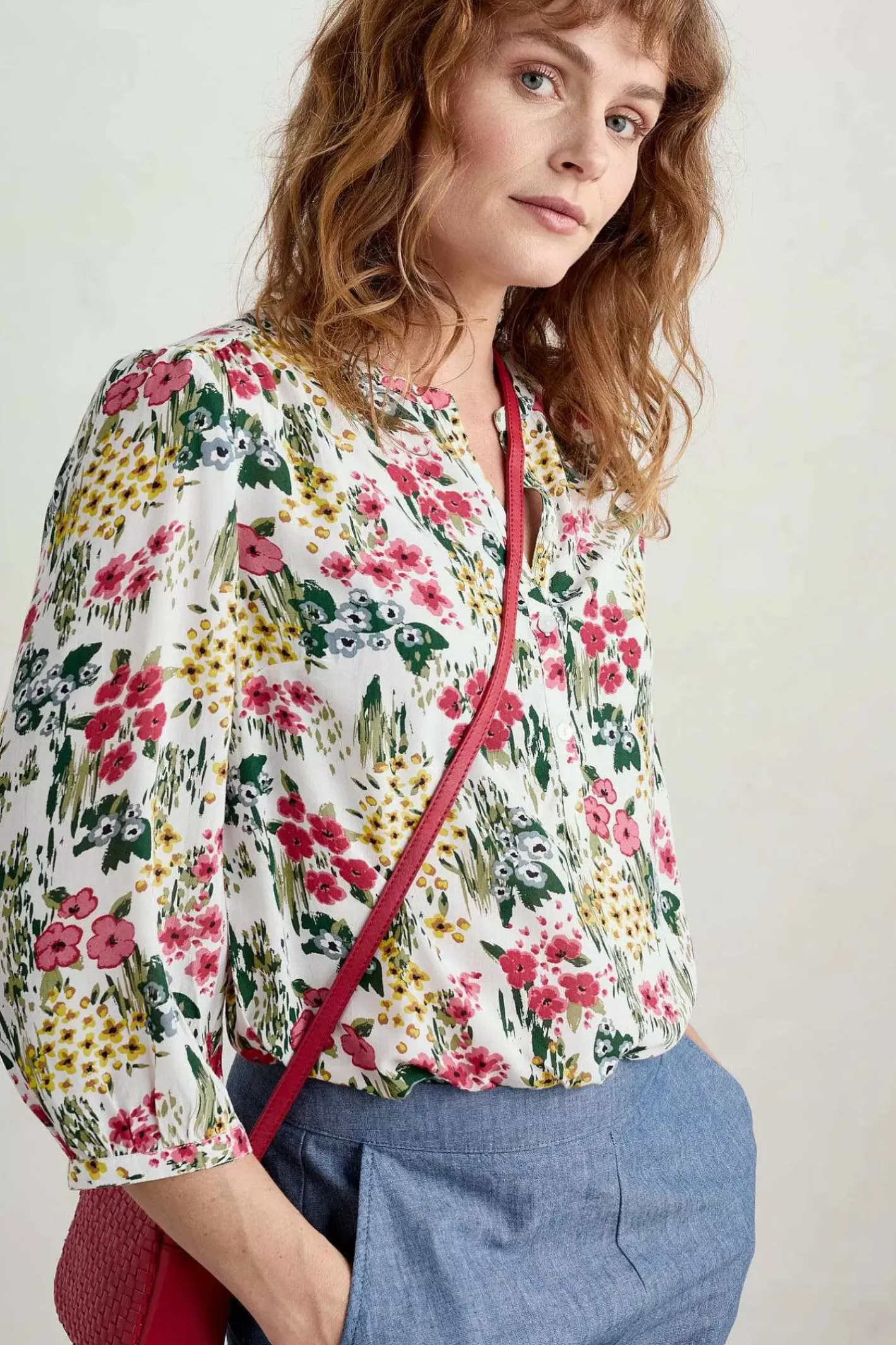 A Light, Flowy Blouse, With A Vibrant Seasalt Print Designed In Our Falmouth Studio By Our In-House Designers. The 3/4 Sleeves Have Little Gathers At The Shoulders And Cuffs For A Subtle Blouson Shape, While Gathers Along The Front Yoke And Split Hems Give It A Skimming Drape. Looks Lovely Loose Over Trousers Or Tucked Into Skirts.