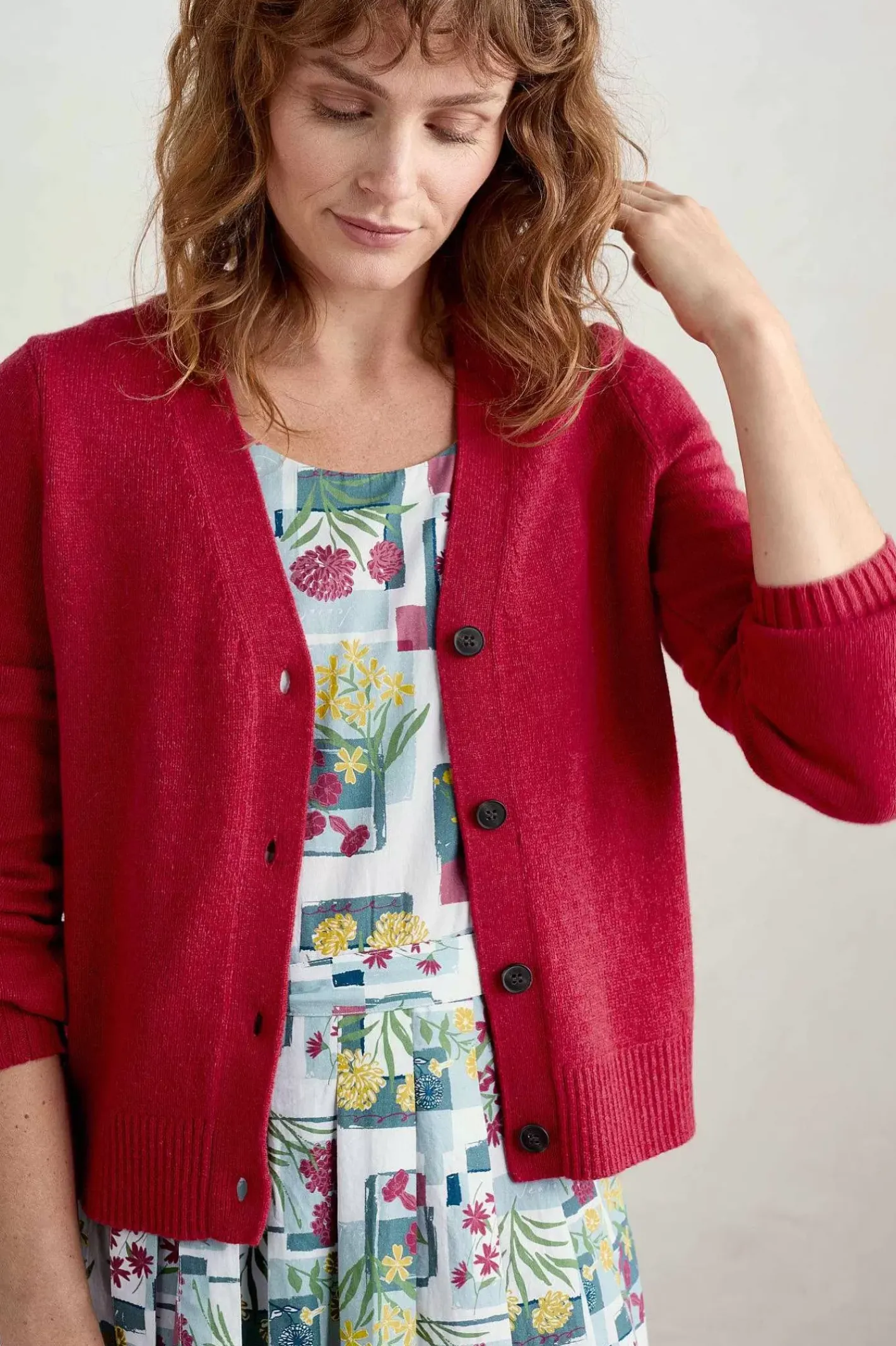 A Stylish V-Neck Cardigan With Subtle Blouson Sleeves, In An Organic Cotton Yarn Blend Which Gives A Lovely Melange To Our Carefully Chosen Coastal Colours. The Perfect Layer For Summer Evenings.
